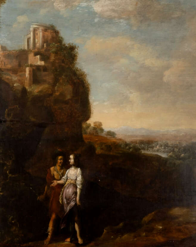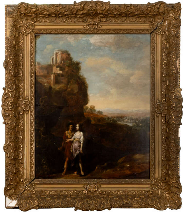 Paar in arkadischer Landschaft, Öl auf Holzplatte, 53 x 45 cm Plattenmaß, reinigungsbedürftig, partiell retuschiert, Platte restauriert, partiell gerissen, reinigungsbedürftig