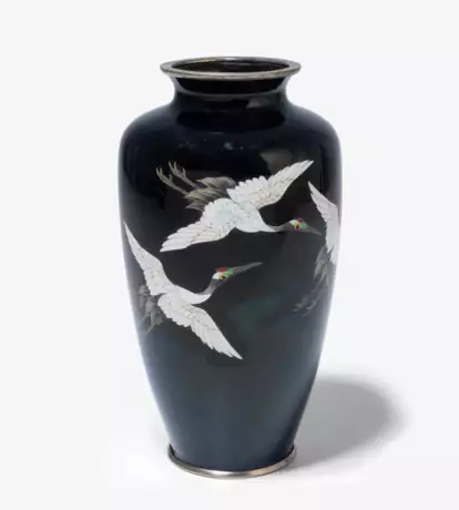 Japan, 20.Jh. Email cloisonné. Am Boden gemarkt MADE IN JAPAN. Balusterform. Dekoriert mit drei fliegenden Kranichen auf schwarzem Fond. H 18,5 cm.