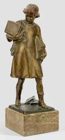 Bronze, braun patiniert. Sign.; Marmorsockel. Auf quadratischer Plinthe stehendes junges Schulmädchen mit Büchern unter den Armen. Seltene, wohl um 1910-1920 entworfene Jugendstil-Statuette Seiferts, der seit circa 1895 in Berlin ansässig war, wo er an der Akademie studierte und mehrfach die Großen Berliner Kunstausstellungen beschickte. Ges.-H. 68 cm.