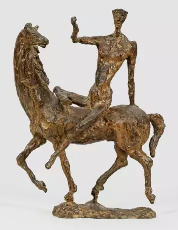 Bronze, braun patiniert, 1944. Sign. "W. Linck" und nummeriert 1/5. Guss M. Pastori Cire Perdue. Grob ausgeformte Darstellung einer Frau auf einem trabenden Pferd, beide nach rechts gewandt, mit teilw. überlängten Proportionen. Die Dame gestikuliert mit erhobener rechter Hand, während sie sich mit der linken auf der Kruppe des Pferdes aufstützt und den rechten Knöchel über dessen Hals legt. Das Pferd neigt ihr als anscheinend aufmerksamer Zuhörer ein Ohr zu. H. 48,5 cm.