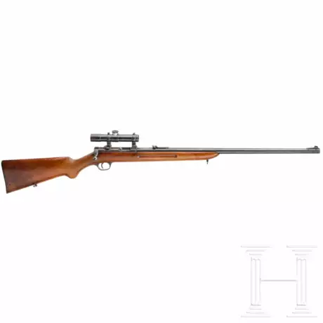 Kal. .22lr, Nr. 15434, blanker Lauf, Länge 650 mm. Höhen- und seitenverstellbares Visier. Systemhülse mit Walther-Banner und gemarkt "Waffenfabrik Walther Zella-Mehlis Thüringen". Beschuss Krone/"BUGN". Ohne Sicherung. Montiert mit Einhaksystem ein originales sowjetisches ZF PU, gemarkt mit Stern / Hammer Sichel / "1942", Fertigung Omsk, technisch und optisch in Ordnung. Originale Brünierung, dünn auf der Hülse. Nussholzschaft mit leichten Gebrauchsspuren. Kunststoffkolbenkappe mit Walther-Banner, seitlich Sprung von 4 cm länge. Relativ seltenes Sammlerstück. Länge 112 cm.