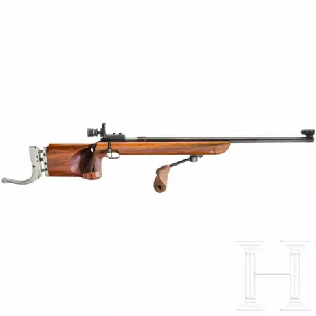 Kal. .22lr, Nr. 63502, blanker Lauf, Länge 70 cm. Gültiger Beschuss. Blanker Zylinderverschluss mit doppelter Verriegelung. Lauf und System matt brüniert. Auf Hülsenbrücke Walther-Schleife. Justierbarer Abzug. Dunkler, schwerer Match-Schaft mit Daumenloch, Pistolengriff, Backe Handgriff und verstellbarer Hakenkappe. Diopter mit Ringkorn und Korntunnel. Gesamtlänge 131 cm.