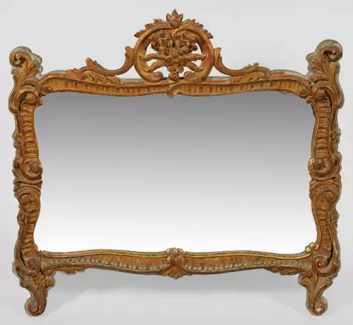 Holz, geschnitzt, gefasst und ehemals vergoldet. Querrechteckig angelegte Spiegelrahmung aus gestreckten, gegeneinander gestellten Voluten und Blattwerk. Geschweift ansteigende, durchbrochen gearbeitete Blütenbekrönung mit Volutenspangen. 73 cm x 80 cm.