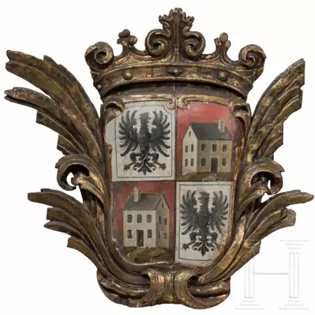 Fein geschnitztes, polychrom gefasstes und großflächig vergoldetes Wappen der Grafenfamilie Haimhausen. Die Vergoldung sowie Farbfassung berieben und partiell erneuert. An den seitlich ausladenden Elementen bestoßen, stellenweise größtenteils retouchierte Fehlstellen. Verso verstärkt. Maße 60 x 60 cm.