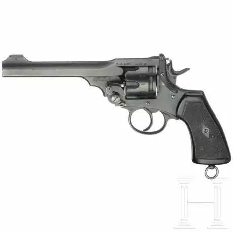 Kal. .455Webley, Nr. 171563, nummerngleich. Blanker Lauf, Länge 6". Sechsschüssig. Beschuss. Fertigung 1915. Standardbeschriftung. Div. Abnahmen broad arrow. Alte, matte Arsenal-Nachbrünierung, Tragespuren an den Kanten. Schwarze Hartgummigriffschalen. Fangring.