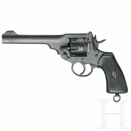 Cal. .455Webley, SN. 424854, nummerngleich. Blanker Lauf, Länge 15 cm. Sechsschüssig. Britischer Beschuß, Abnahmen Broad Arrow und Inspektorenmarken. Die Rahmenbrücke links gemarkt "Mark VI", der Rahmen links vorne gemarkt "Webley / Mark VI / Patents / 1918". Zur Gänze leicht überarbeitet und neu brüniert. Trommel "unshaved". Schwarze Kunststoffgriffschalen mit leichten Gebrauchsspuren. Fangring.
