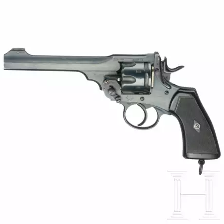 Kal. .455Webley, Nr. 260742, nummerngleich. Blanker Lauf, Länge 15 cm. Sechsschüssig. Britischer Beschuß, Abnahmen Broad Arrow und Inspektorenmarken. Die Rahmenbrücke links gemarkt "Mark VI", der Rahmen links vorne gemarkt "Webley / Mark VI / Patents / 1917". Vollständiges originales Finish. Trommel "unshaved". Schwarze Kunststoffgriffschalen, unbeschädigt. Fangring. Neuwertiger Zustand.