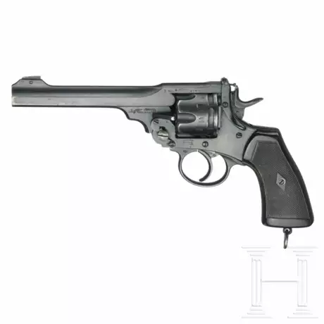 Kal. .455Webley, Nr. 374341, nummerngleich, die Trommel arsenalmäßig durch Überstempeln der alten Nummer nummerngleich gemacht. Blanker Lauf, Länge 15 cm. Sechsschüssig. Britischer Beschuß, Abnahmen Broad Arrow und Inspektorenmarken. Die Rahmenbrücke links gemarkt "Mark VI", der Rahmen links vorne gemarkt "Webley / Mark VI / Patents / 1918". Unten vor dem Abzugsbügel "ORION" Importeursstempel. Vollständiges Finish, Arsenal-Rework. Trommel "unshaved", etwas wackelig. Schwarze Kunststoffgriffschalen, unbeschädigt. Fangring.