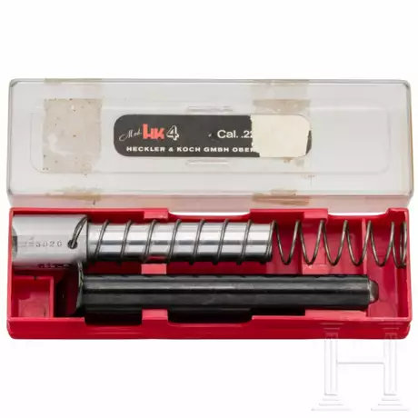 Kal. .22lr, Nr. 105020, Blanker Lauf mit Beschuss Adler/N und Schließfeder. Magazin für acht Patronen, gemarkt ".22 LR / HK 8/70". In originaler Kunststoffbox.