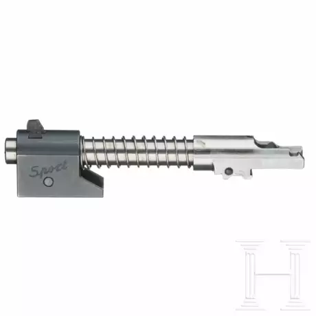 Cal. 9mmLuger, SN. NW-4810, blanker Polygonlauf, Länge 140 mm. Dt. Beschuss. Komplett mit Laufgewicht und Schließfeder. Fast neue Erhaltung.