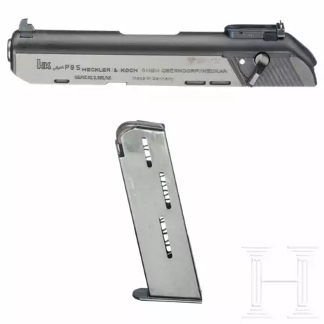 Cal. 9mmLuger, SN. 109574, nummerngleich. Blanker Polygonlauf, Länge 102 mm. Dt. Beschuss. Sportvisier, am Wechselverschluss. Vollständige, originale Brünierung am Verschlussträger. Links am Verschluss Standardbeschriftung. Dazu brüniertes Magazin 9 mmLuger.