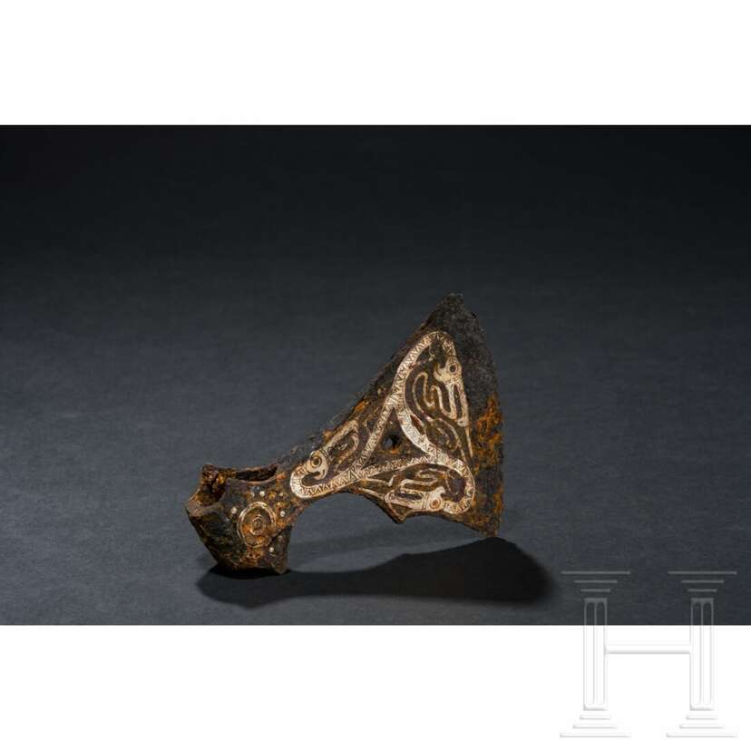 Axe with shaft hole directly in the neck, with pointed shaft hole flaps on both sides at the top and bottom. The axe blade with a slightly curved cutting edge on the upper side is simply indented. The underside is indented twice with a point in the middle. The axe blade is perforated in the middle. On both sides of the axe blade there is a full-surface silver inlay: a triskelion, whose three extensions, starting from the points of a triangle with indented sides, each end in a dragon's head with elongated jaws. The inlay on each side has variations in the details: on one side, the ribbon-shaped dragon bodies arranged in a triangle are decorated with a zigzag pattern with circular eyes in the spandrels, on the other side with circular eyes between curved lines. The heads are also different, on one side with strikingly curved, serpentine, excessively elongated lower jaws. On the other side, they have jaws of equal length. The inlays on both sides of the shaft hole in the neck of the axe also differ, although the composition is basically similar: on one side, a circular eye with concentric lines surrounded by dots; on the other side, a quartered circle with dots in the quadrants, also surrounded by dots. On the neck of the axe is a small triskelion with spirals on the extensions. Length 14.7 cm. Height 11 cm. Surface partially rust-marked and covered with iron oxides. However, the inlay is well preserved and largely recognisable. An exceptionally beautiful and rare specimen of a Viking axe with typical features of the Jelling style.
