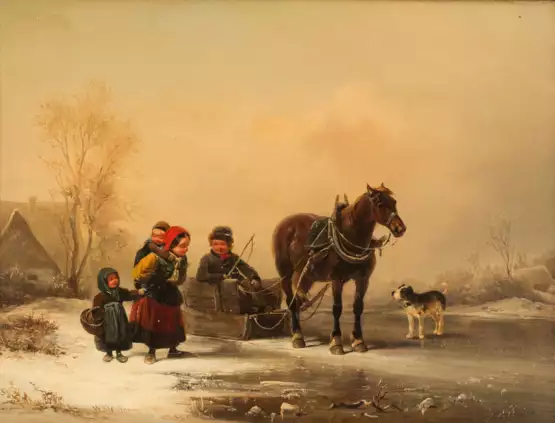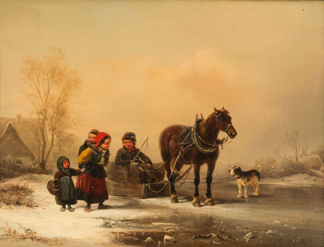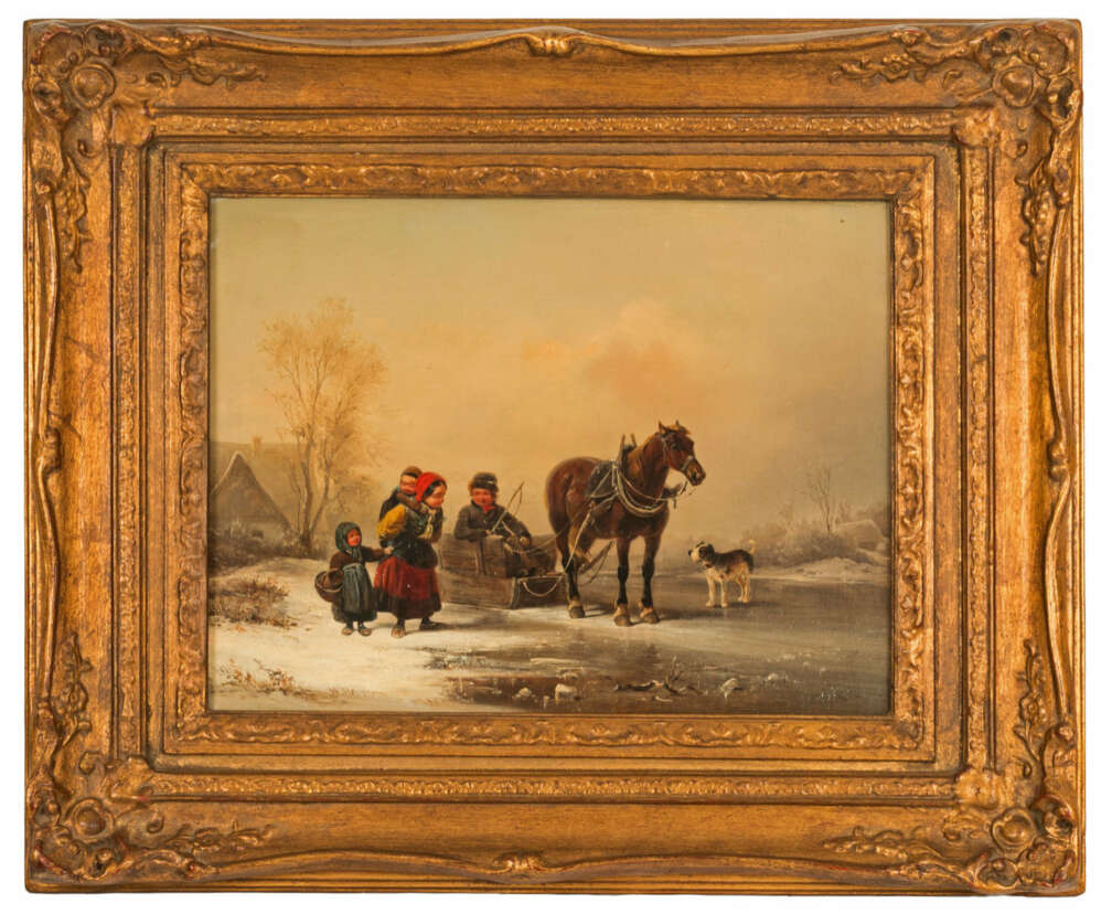 Winterszene mit Familie, Pferd und Hund auf zugefrorenem See, Öl auf Leinwand, 25,6 x 33 cm Leinwandmaß, signiert, 48 datiert, partiell leicht craqueliert, restauriert, partiell retuschiert, doubliert ein kleiner Farbabplatzer am Rand, leicht fleckig