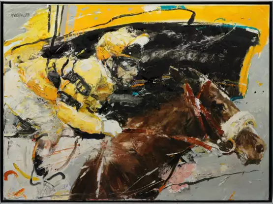 Frühes, expressiv-realistisches, mit furiosem Duktus gemaltes Werk des an der Kunstakademie in Maastricht ausgebildeten Malers und Bildhauers, das die Flüchtigkeit des Augenblicks und Schnelligkeit des Pferderennens zum Ausdruck bringt. Öl/Lwd.; L. o. sign. u. dat. (19)88. 100 cm x 130 cm. Rahmen.