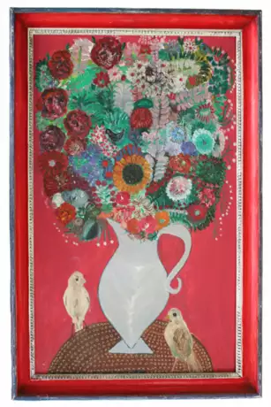 (1921-2004). "kwiaty z dworna ptasrkami" (Blumen mit Vögelchen). Öl auf Hartfaser, 1976. Ca. 59,5 x 40 cm. Unt. li. sign. u. dat. Verso bet. Ger.