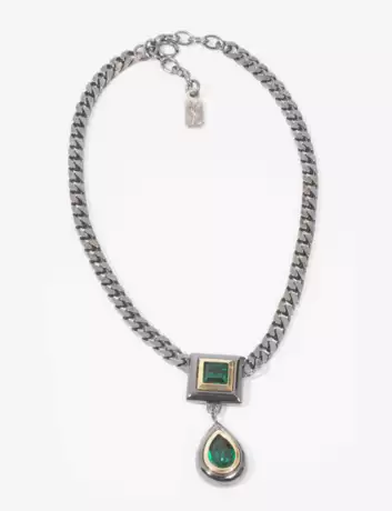 Aus geschwärztem Metall mit grünen Kunststeinen. Flache Kettenglieder. L (verstellbar) max. 44 cm.