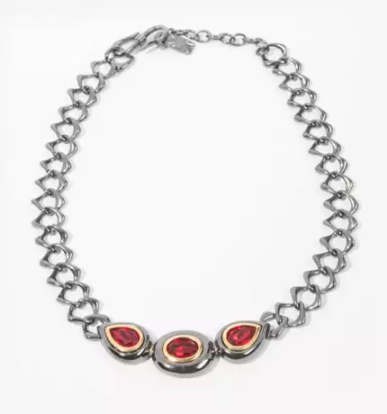 Aus geschwärztem Metall mit roten Kunststeinen. Bewegliche Glieder. L (verstellbar) max. 48 cm.