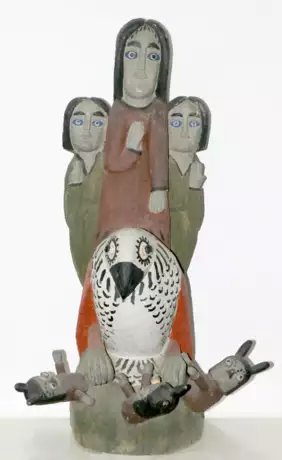 (1910 - 1988 Krzyzka). Drei heilige auf Vogel stehend. Holzskulptur geschnitzt u. polychrom gefasst. H: 74 cm. Rückseitig sign.