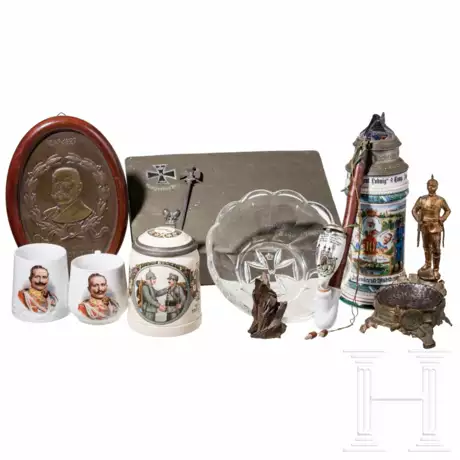 Reservistenkrug des K.B. 10. IR (Infanterist Mühlbauer, 1911 - 1913) aus Porzellan (zwei kleine Löcher und Haarrisse im Boden) mit farbig gedrucktem bzw. handbemaltem Dekor, schauseitig die Schulterklappe, seitlich Militärszenen und Namensleisten, Zinndeckel mit Löwendrücker und Glasprisma (bestoßen). Gesamthöhe ca. 27 cm. Ein kleiner Steinzeugkrug 1914/15 (bestoßen, krakeliert) als neuzeitliche Nachfertigung. Eine Reservistenpfeife der Artillerie. Zwei Porzellantassen mit Druckportraits von Wilhelm II. (berieben). Glasschale (Durchmesser 20 cm) mit EK 1914 im Boden. Metall-Aschenbecher mit Soldatenfigur. Ovales Hindenburg-Portrait aus geprägtem Blech (Höhe 26 cm). Leere Kiste "Kriegs-Erinnerungen". Brieföffner mit Adlermotiv. Teilweise leicht beschädigt, Gebrauchs- und Altersspuren.