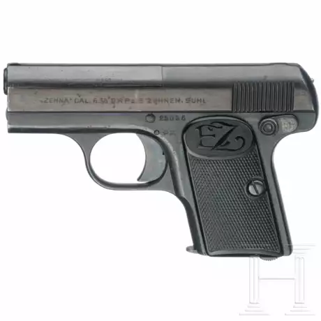 Cal. 6,35mmBrowning, SN. 23035, rauer Lauf, Länge 60 mm. Sechsschüssig. Beschuss Krone/N. Laufhalterung mit glatter Vorderfläche. Links am Verschluss bezeichnet "Zehna Cal. 6,35 D.R.P.a. E. Zehner, Suhl". Überarbeitet, aufgefrischte Brünierung. Schwarze Hartgummigriffschalen mit Logo "EZ". Magazin mit senkrechten Sichtschlitzen.