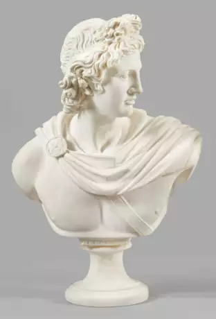 Alabaster. Firmenmarke "Maska" (Griechenland). Büste nach dem Vorbild der berühmten antiken Mamorstatue des "Apollo von Belvedere" in den Vatikanischen Museen in Rom, die Ende des 15. Jhs. wiederentdeckt wurde. Seither gilt der Apollo von Belvedere als das herausragende Beispiel klassischer Bildhauerkunst und Schönheit, er prägte besonders die Ästhetik des Klassizismus. In griechisch bez. "Apollon". H. 54 cm.