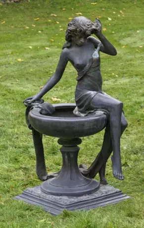 Bronze, dunkel patiniert. Auf rechteckigem Sockel rundes Wasserbassin auf schmalem Stand. Am Rand sitzend ein Mädchen in herabgleitendem Gewand. Ges.-H. 120 cm.