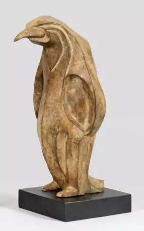 Bronze, überwiegend in hellen Erdfarben patiniert. Stilisierte Darstellung eines stehenden Pinguins. Schwarz gefärbter Sockel. Ges.-H. 54,5 cm.