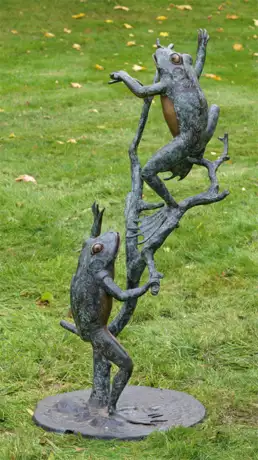Bronze, dunkel patiniert. Überlebensgroße Darstellung zweier kletternder Frösche mit Wasserspeivorrichtung auf einem Baum mit runder Terrainplinthe. H. 100 cm.