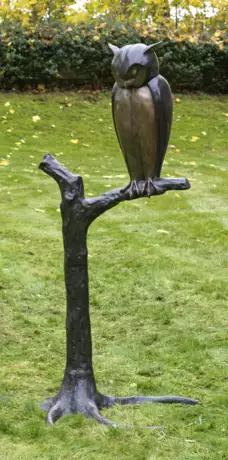 Bronze, dunkel patiniert. Überlebensgroße, leicht stilisierte Darstellung einer Eule oder eines Kautzes auf einem angedeuteten Baum mit Wurzeln als Sockel. H. 170 cm.