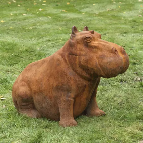 Gusseisen mit Rostpatina. Naturalistische Darstellung eines sitzenden Flusspferds. H. 70 cm.