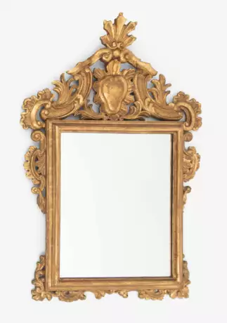 Mitte 18.Jh. Profilierter Rahmen mit ornamental reich geschnitzter Einfassung. Fronton mit zentraler Kartusche und Muschelaufsatz. Auf rotem Poliment vergoldet. Ergänztes Spiegelglas. 104 x 71 cm.