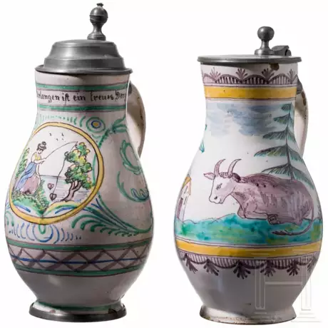 Auf weiß glasiertem Grund. Ein Krug mit bunt gemalter liegender Kuh in Landschaft. Bandhenkel mit manganfarbenem Strichdekor auf dem Bandhenkel. Flacher Zinndeckel mit Gravur "BM". Lippenrand bestoßen, Standring mit kleinen Bestoßungen. Kleine Fehlstellen in der Glasur. Höhe 25 cm. Der zweite Krug mit zentralem Rundmedaillon mit Darstellung eines Anglers gerahmt von Rankenwerk. Hals mit gemalter Inschrift "All m hoffen und Verlangen ist ein freues Herz zufangen". Gewölber Zinndeckel. Bandhenkel mit grünem Strichdekor. Fuß mit Zinnring. Zinn mit kleinen Fehlstellen, kleine Bestoßungen am Zinnring. Höhe 25 bzw. 27 cm.