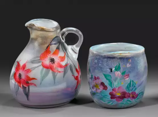 Farbloses, teilw. milchiges Glas. Überfänge in Gold, Grün, Rot, Violett und Schwarz, teilw. leicht irisierend. Jeweils Sign. "Eisch", dat. "90" und "91", monogr. "S.Y." und "M.W.". H. 9,5 cm - 14 cm.