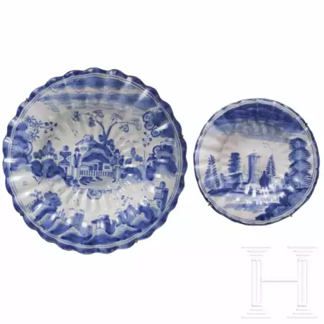 Jeweils ein in Unterglasurblau mit architektonischen Motiven bemalter Fayence-Teller. An der Fahne des großen Tellers mit Chinoiserie-Dekor eine Reparatur, verso eine Unterglasurmarke. Glasurfehler, am Rand stellenweise Abplatzungen. Durchmesser 23 und 33 cm.