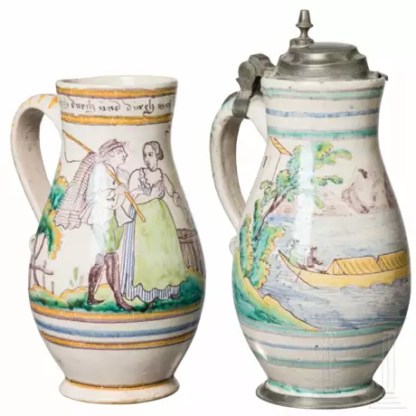 Fayence. Birnenförmiger Korpus, umlaufend verziert mit einem Paar vor einem Gartenzaun, Inschrift "Wenst mich durch und durch wirst kennen, wirst mich gloich zum Weib ernennen." Unglasierter Boden. Höhe: 22,5 cm / Der andere Krug mit Darstellung eines Ruderbootes vor einer Felsenlandschaft. Gewölbter Zinndeckel beschädigt. Mündung mit Abplatzer. Höhe: 27,5 cm