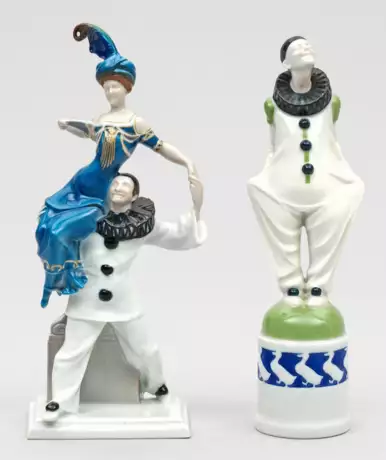 Auf profiliertem Rechteckssockel vor einer Steintafel stehender Pierrot, eine Dame in langem Abendkleid mit Fächer und Federhut schulternd bzw. mit Entenreigen stehender Clown. Entw. Ferdinand Liebermann, 1911 bzw. Entw. Albert Caasmann, 1912. Modell-Nr. K 169 und K 176. Je Entw.-Bez. "F. Liebermann" bzw. "A. Caasmann". Polychrome Unterglasurmalerei, teilw. mit dezenter Goldstaffage. Teilw. minim. rest.; Manufakturmarke. H. 23,5 cm.