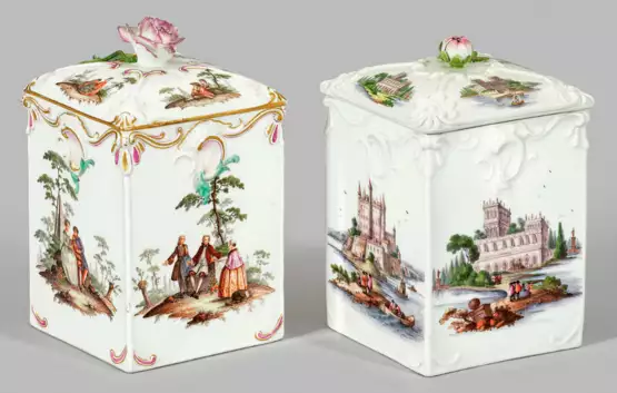 Los 472 | Zwei Meissen Tabakdosen mit Watteauszenen und Stadtveduten
