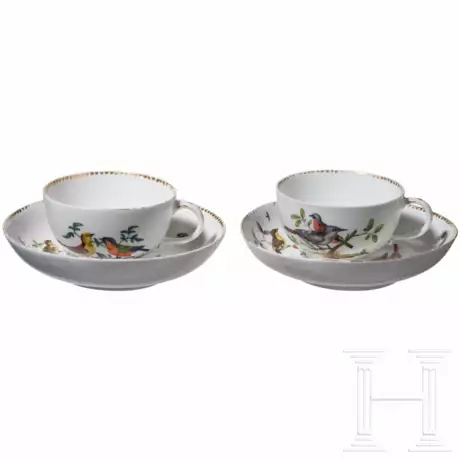Porzellan, farbig bemalt. Im Spiegel der Untertassen sowie auf der Innen- und Außenseite der Tassen polychrom gemalter Vogel- und Insektendekor. Unterseiten mit unterglasurblauer Manufakturmarke (1. Wahl). Gold berieben. Ein Standring bestoßen, ansonsten intakt. Höhe Tassen 4,5 cm, Durchmesser UT 13,5 cm.