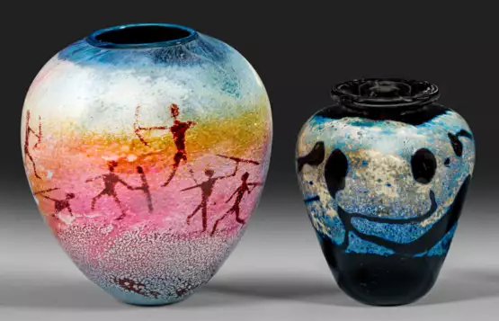 Zwei längsovale Kugelvasen. Schwarzes Glas mit zersprengter, irisiernder Metallauflage, abstrakte Formen bildend, sign. "Sally Worcester", betitelt "Cannon Beach" und datiert "11.77". Farbloses Glas. Unterfang in "Petroglyph Cave"-Design. Die Vase erinnert stark an die Arbeiten des US-Amerikanischen Glaskünstlers Richard Satava. H. 13 cm - 16 cm.