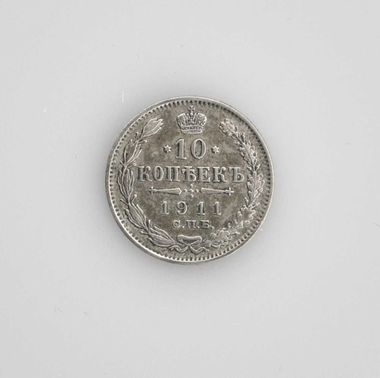 Silver 10 kopecks, 1911.Obverse: 10 kopecks, 1911 and s.p.b. under a crown and surrounded by a laurel wreath.Reverse: Russian coat of arms under the crown.Weight: 1.66 grDiameter 1.75cmThickness 1 mm