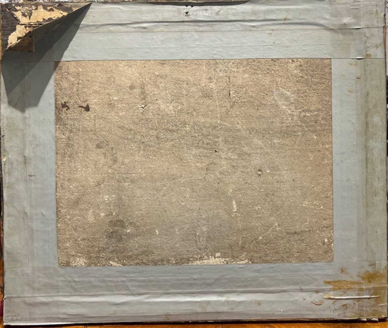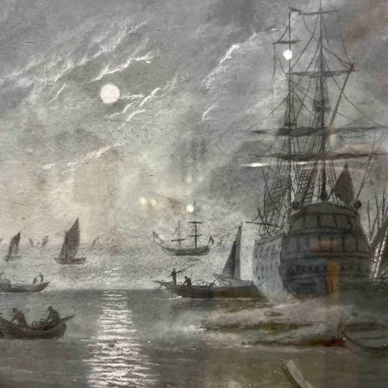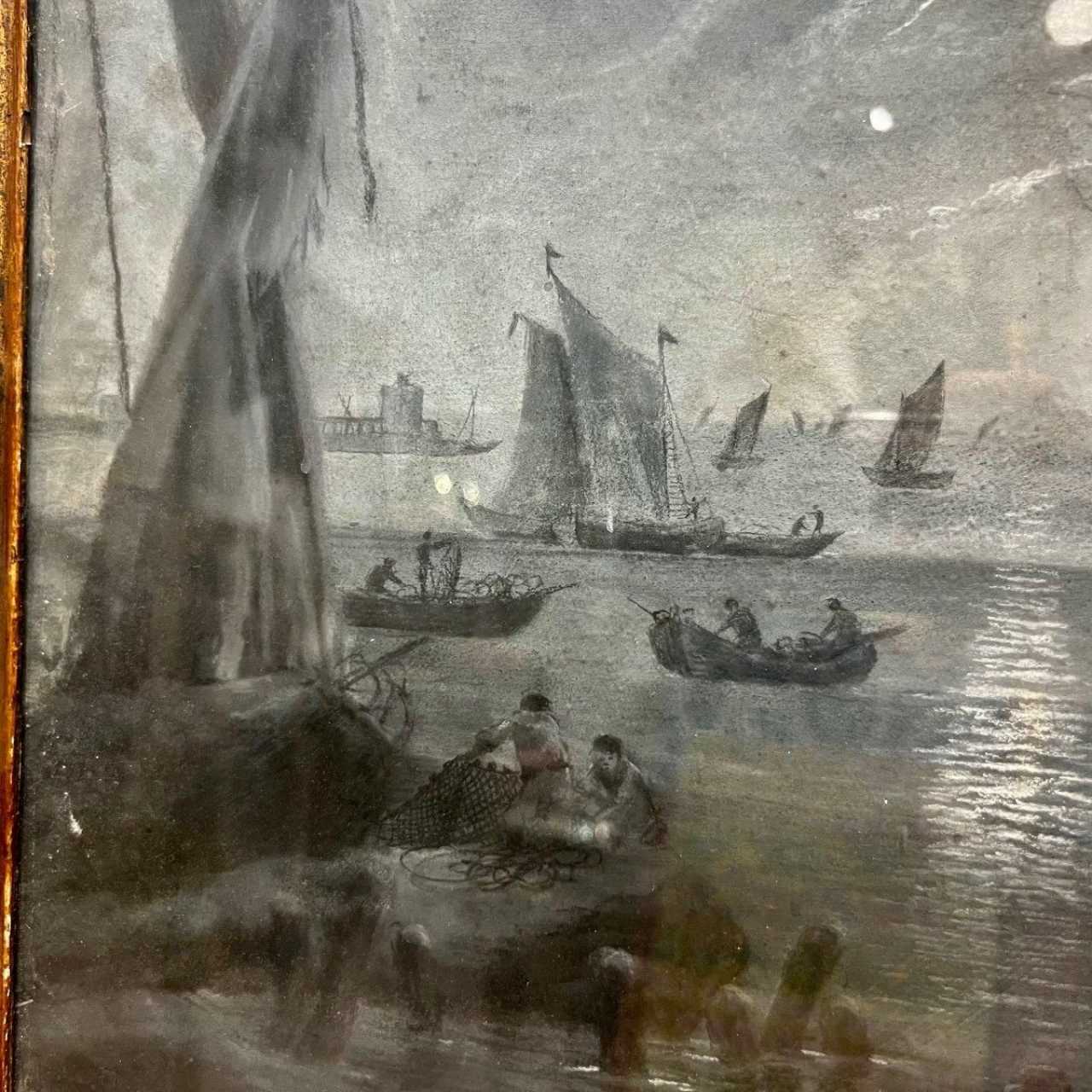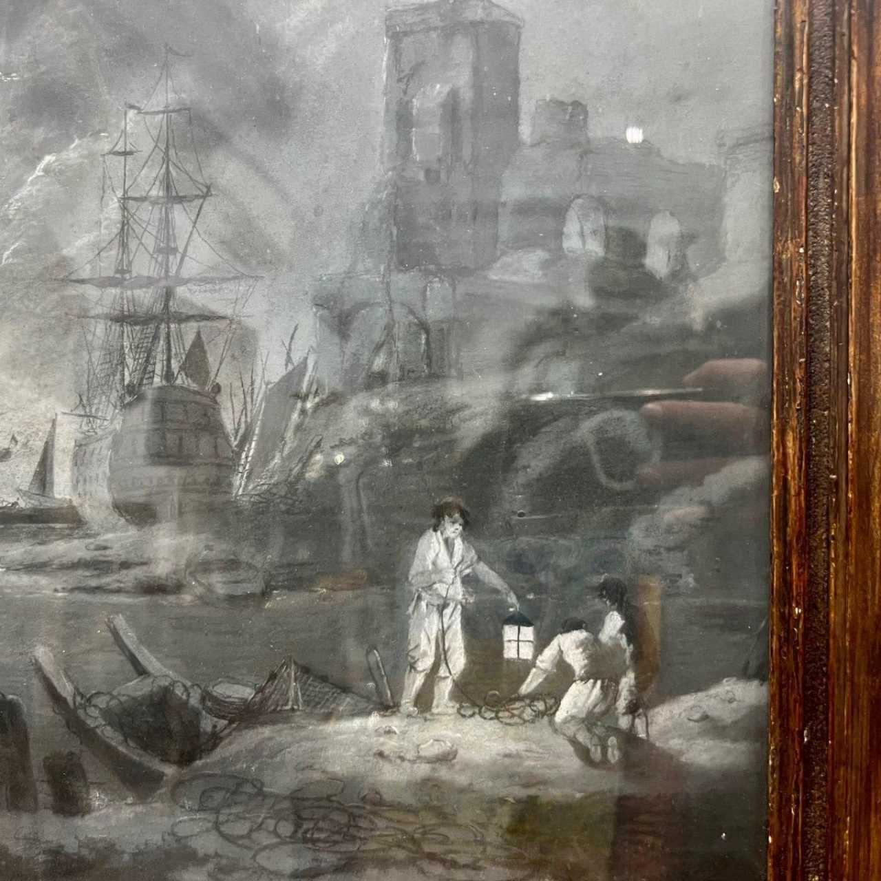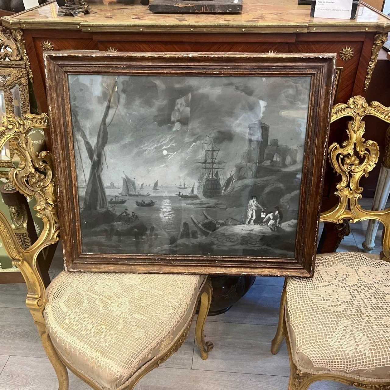 We present you this exquisite grisaille painting representing a moonlit harbour scene in the style favoured by the French artist Charles-François Lacroix de Marseille (1700-1783). He was an artist known for creating landscape and marine paintings in a manner influenced by the styles of Claude Joseph Vernet, Jean-Joseph Kapeller (1702-1790), and Henry dArles. The original frame shows some minor signs of wear. This artwork dates back to the late 18th to early 19th century and measures 64x54 cm, including the frame.This painting can be accompanied by another artwork depicting a similarly peaceful setting, which is available in our inventory. These pieces can be purchased either as a set or individually.