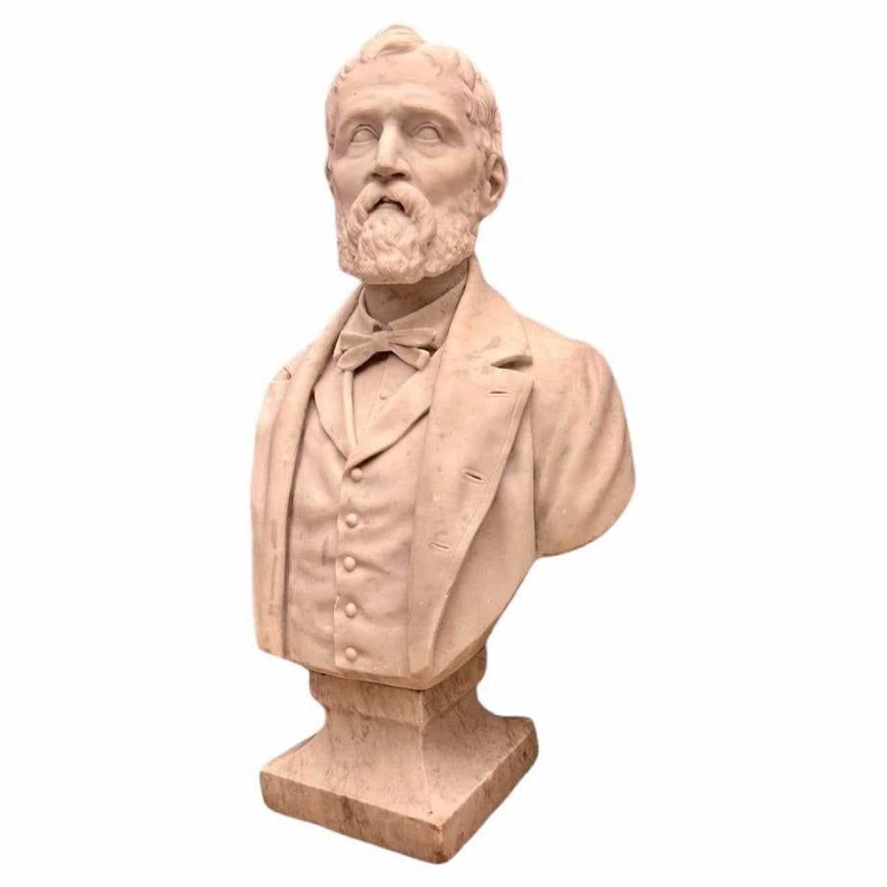 A large bust of a noble man from the end of the 19th century in carrara marble signed by French sculptor, Joseph Vallet, who born in La Boisiére du Doré on August 6, 1841, and died in Nantes on April 29, 1920. Joseph Vallet was mainly active as an sculptor in Nantes and in the Brittany region, particularly in the Loire-Atlantique department, where he created a number of altars and contributed statues for churches. This bust boasts an unmatched level of perfectionism and finesse, both in the face and the hair as well as in the details of his costume.
