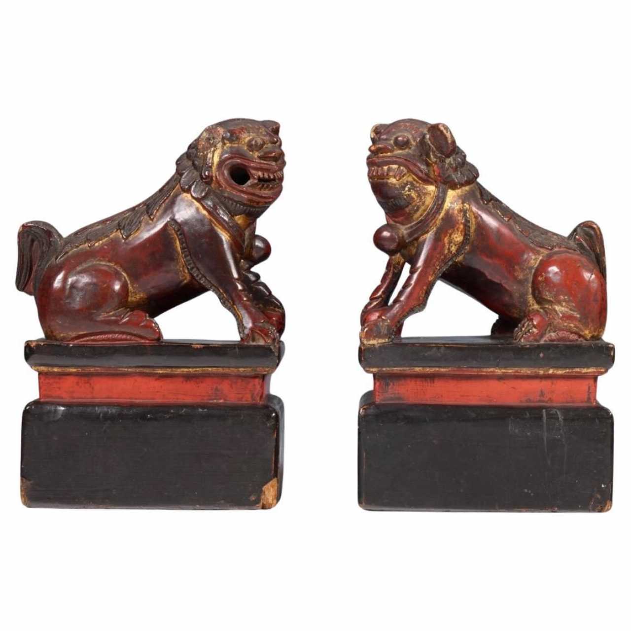 We present you with this stunning pair of statues representing Chinese guardian lions, also known as lions of Fo, made in red and gold lacquer and painted wood. Their origins date back to the late 19th century.Chinese guardian lions or the lions of Fo are iconic mythical guardian creatures in Chinese culture. They are commonly depicted as lion-like figures, often in pairs, and are believed to possess protective and symbolic qualities. They are often associated with protection and good luck and are believed to ward off negative energy or evil spirits. Their presence is commonly seen in front of palaces, temples, and other important structures to provide security and prosperity. Furthermore, these lion-like creatures are typically depicted in pairs - one male and one female. The male lion is often shown with a ball or globe under its paw, representing supremacy over the world. The female lion is usually seen with a lion cub, signifying nurturing and protection.