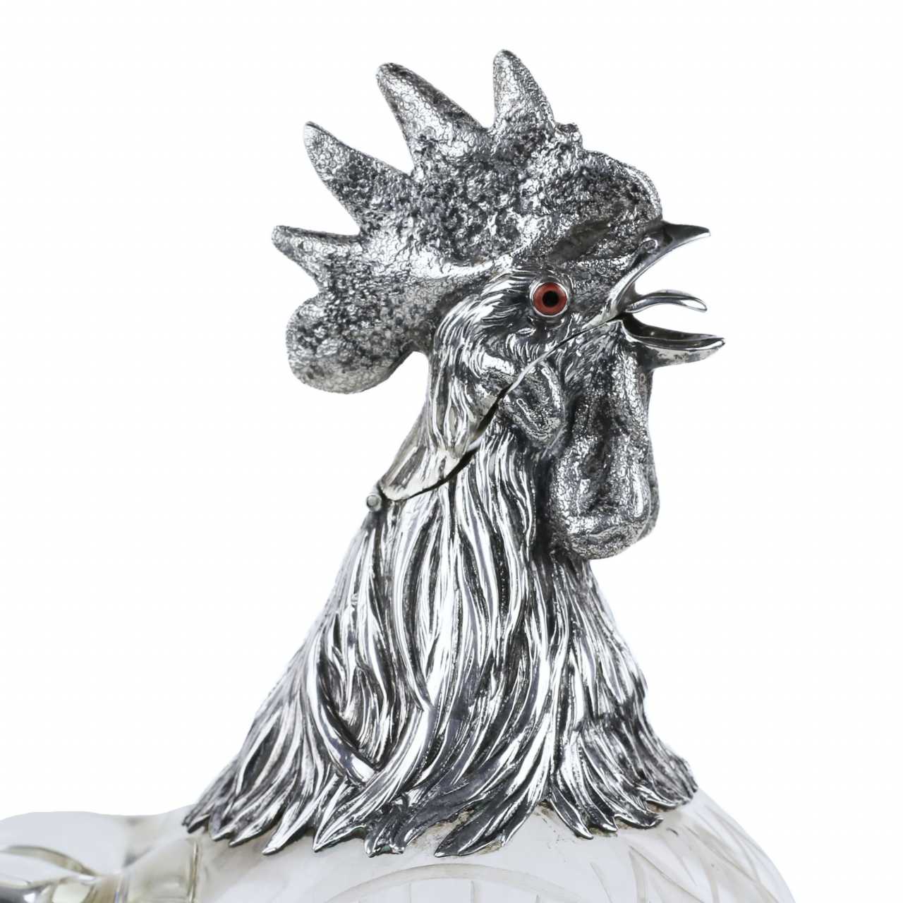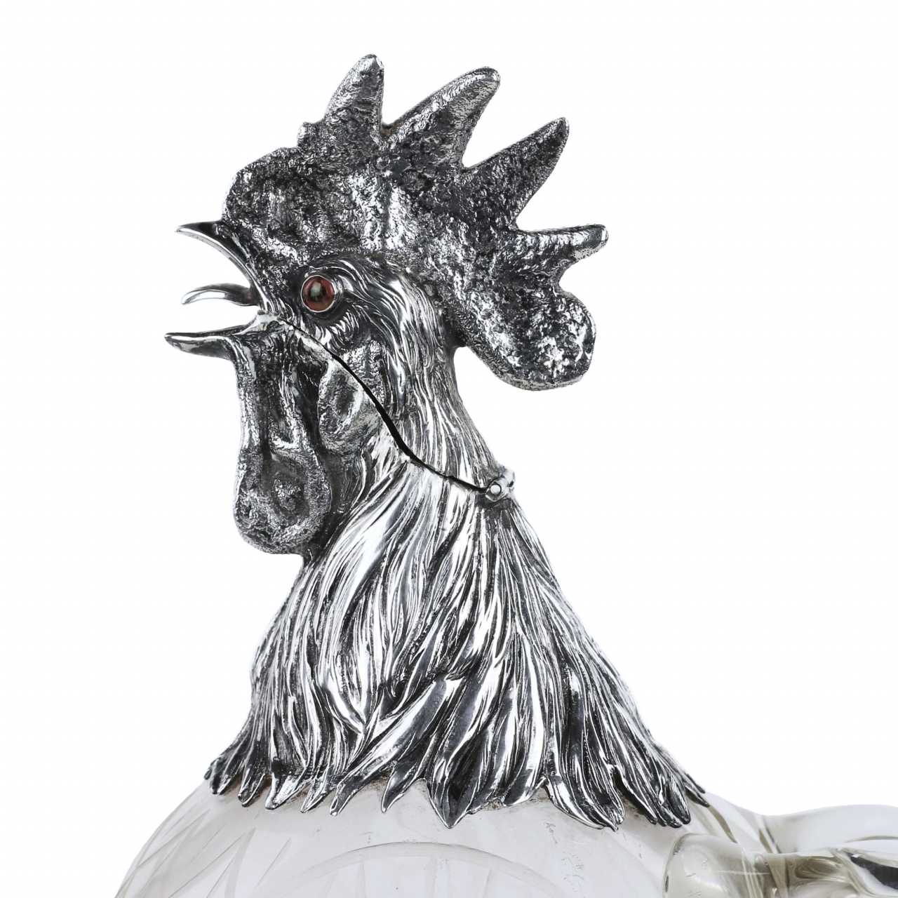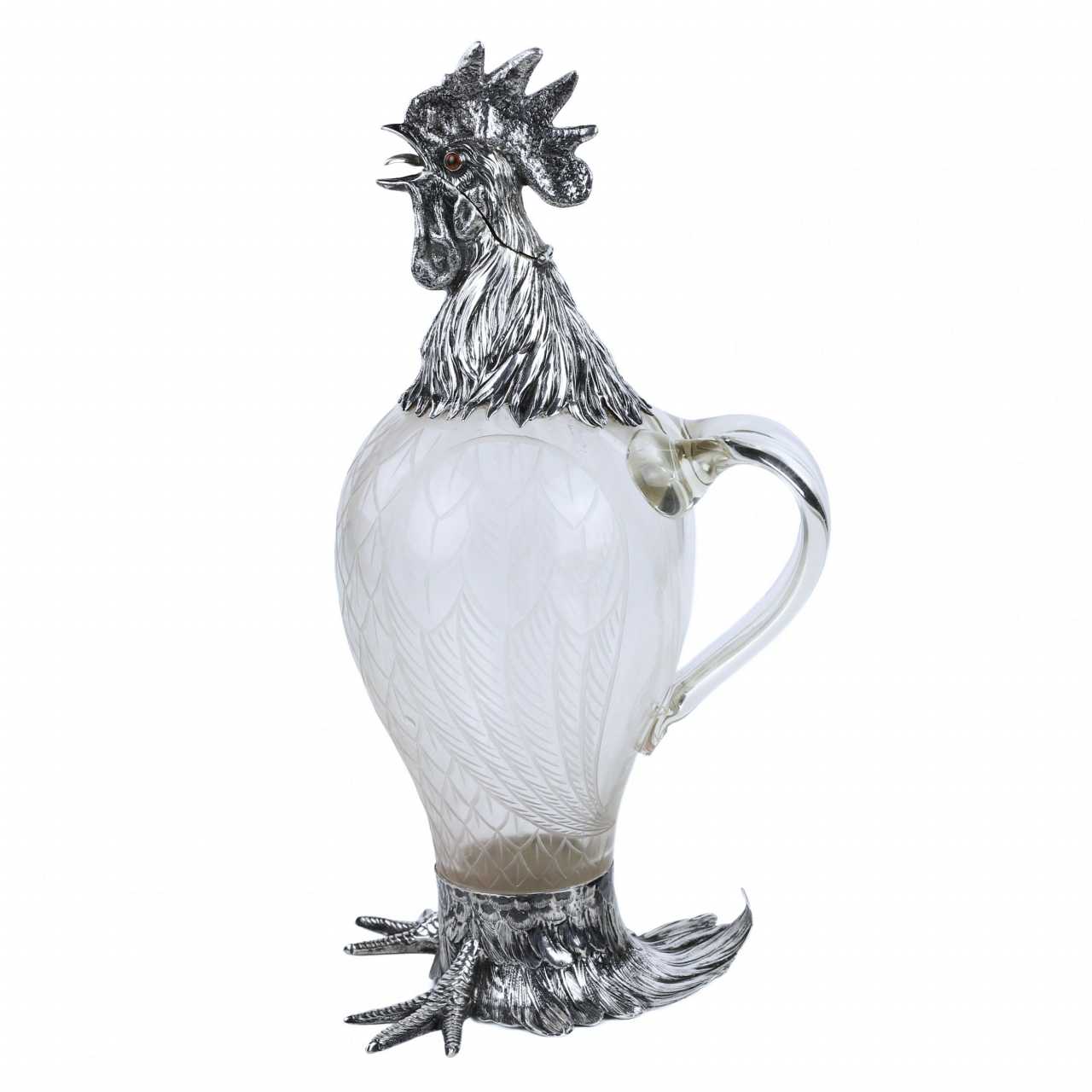 A rare and striking decorative jug in the form of a rooster, combining transparent engraved glass and finely modelled silver mounts of high artistic merit. The upper section is a hinged lid shaped as a rooster’s head, featuring a crisply defined comb and beak, and expressive red glass eyes imitating the lifelike gaze of a bird.The smooth glass body is adorned with engraved feather motifs that enhance the zoomorphic character of the object. The lower section is finished as the bird’s tail and clawed feet, masterfully cast in silver with richly textured detail. The silver base serves not only as a stable support but also as a sculptural culmination of the design. A curved glass handle seamlessly integrates into the silhouette, emphasizing its fluid form.Created by the renowned workshop J.D. Schleissner Söhne in Hanau — a celebrated German centre of historical-style silverware — the piece represents a late 19th-century fascination with fantastical animal forms, admired as symbols of luxury and refined taste. Marks: Bearing the maker’s mark of J.D. Schleissner Söhne and full German hallmarks typical for Hanau in the late 19th century. Dimensions: Height 31 cm, width 15 cm.ConditionThe piece is in good condition with minimal signs of age. Silver elements are intact and undistorted; engraving is crisp. ProvenanceGermany, Hanau, J.D. Schleissner Söhne workshop, late 19th century