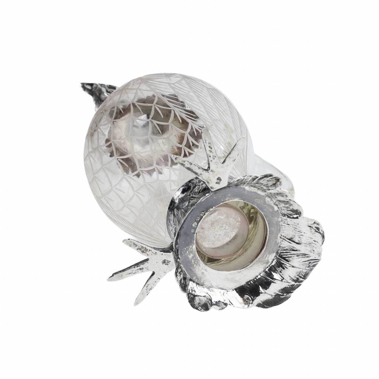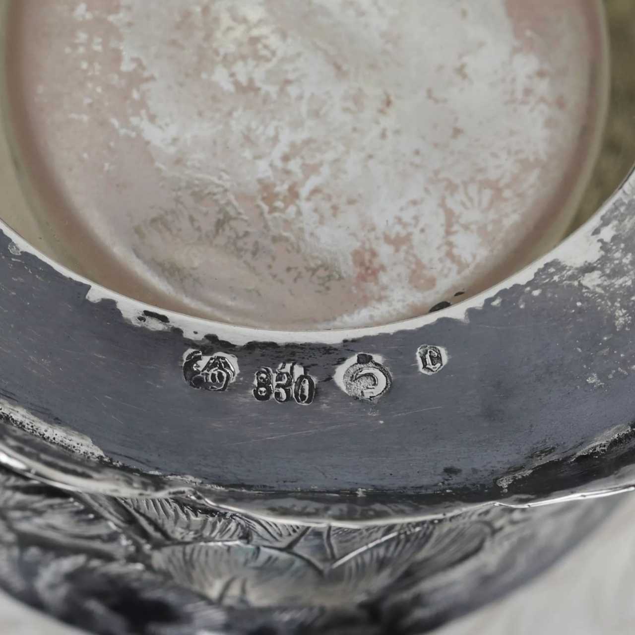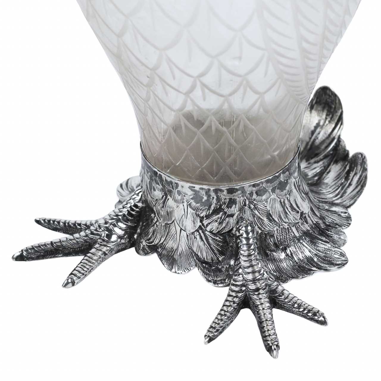 A rare and striking decorative jug in the form of a rooster, combining transparent engraved glass and finely modelled silver mounts of high artistic merit. The upper section is a hinged lid shaped as a rooster’s head, featuring a crisply defined comb and beak, and expressive red glass eyes imitating the lifelike gaze of a bird.The smooth glass body is adorned with engraved feather motifs that enhance the zoomorphic character of the object. The lower section is finished as the bird’s tail and clawed feet, masterfully cast in silver with richly textured detail. The silver base serves not only as a stable support but also as a sculptural culmination of the design. A curved glass handle seamlessly integrates into the silhouette, emphasizing its fluid form.Created by the renowned workshop J.D. Schleissner Söhne in Hanau — a celebrated German centre of historical-style silverware — the piece represents a late 19th-century fascination with fantastical animal forms, admired as symbols of luxury and refined taste. Marks: Bearing the maker’s mark of J.D. Schleissner Söhne and full German hallmarks typical for Hanau in the late 19th century. Dimensions: Height 31 cm, width 15 cm.ConditionThe piece is in good condition with minimal signs of age. Silver elements are intact and undistorted; engraving is crisp. ProvenanceGermany, Hanau, J.D. Schleissner Söhne workshop, late 19th century