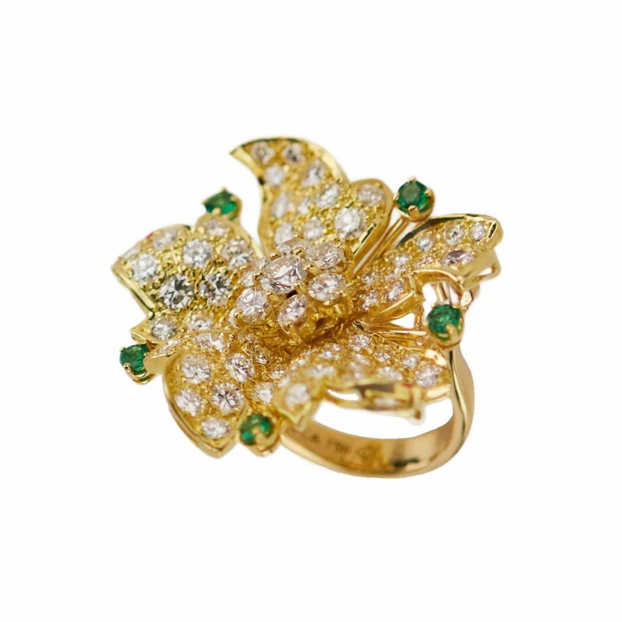 Gold 18K ring with seventy-seven diamonds and five emeralds. Emerald 21th century