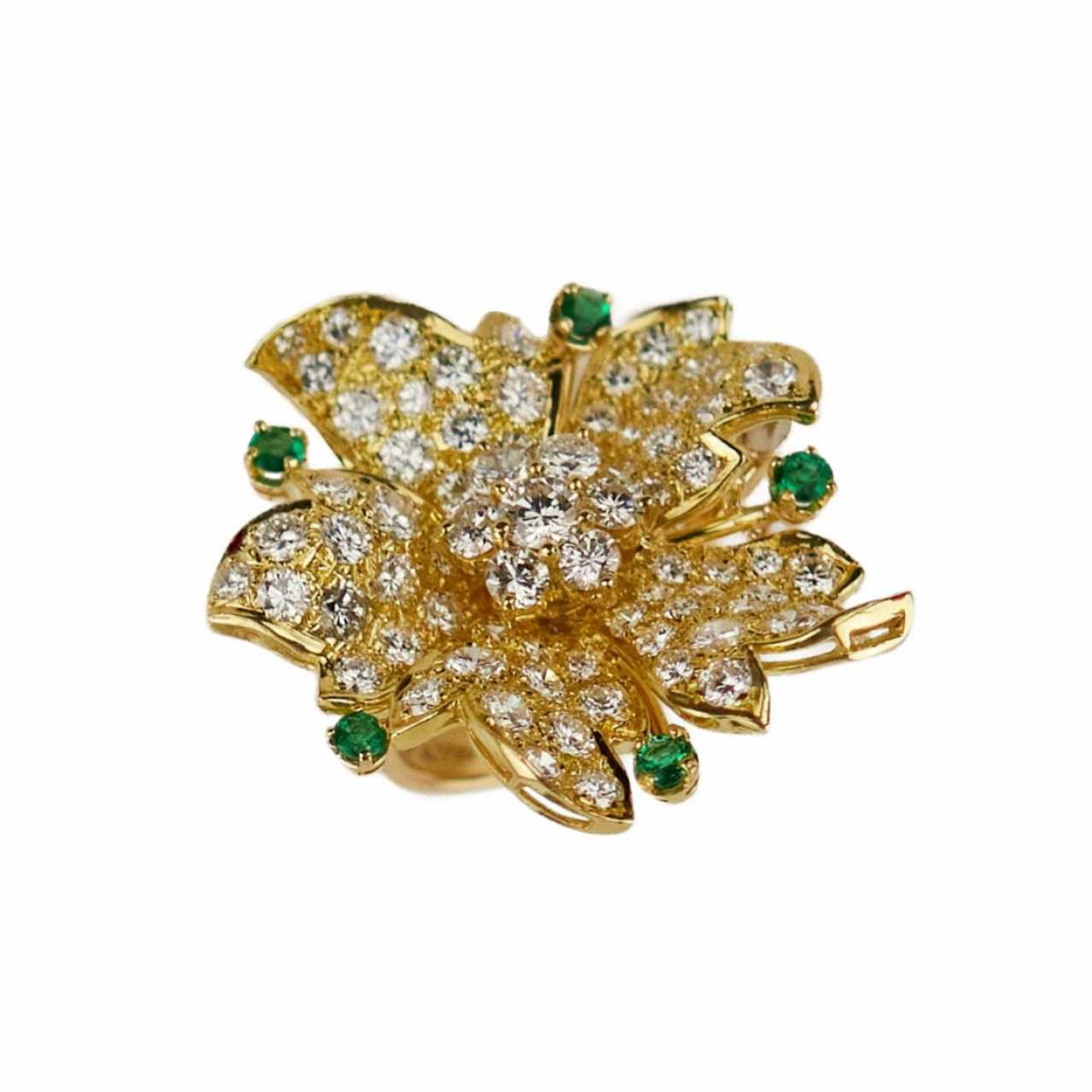 750 gold ring in the shape of a diamond flower with diamonds and emeralds. 77 round diamonds: 4.3 carats, VVS-VS. 5 round emeralds, 0.36 carats. MI. Ring size: 16.5. Weight: 15.13 g. Latvian Assay Office Certificate 3-9-11892023.