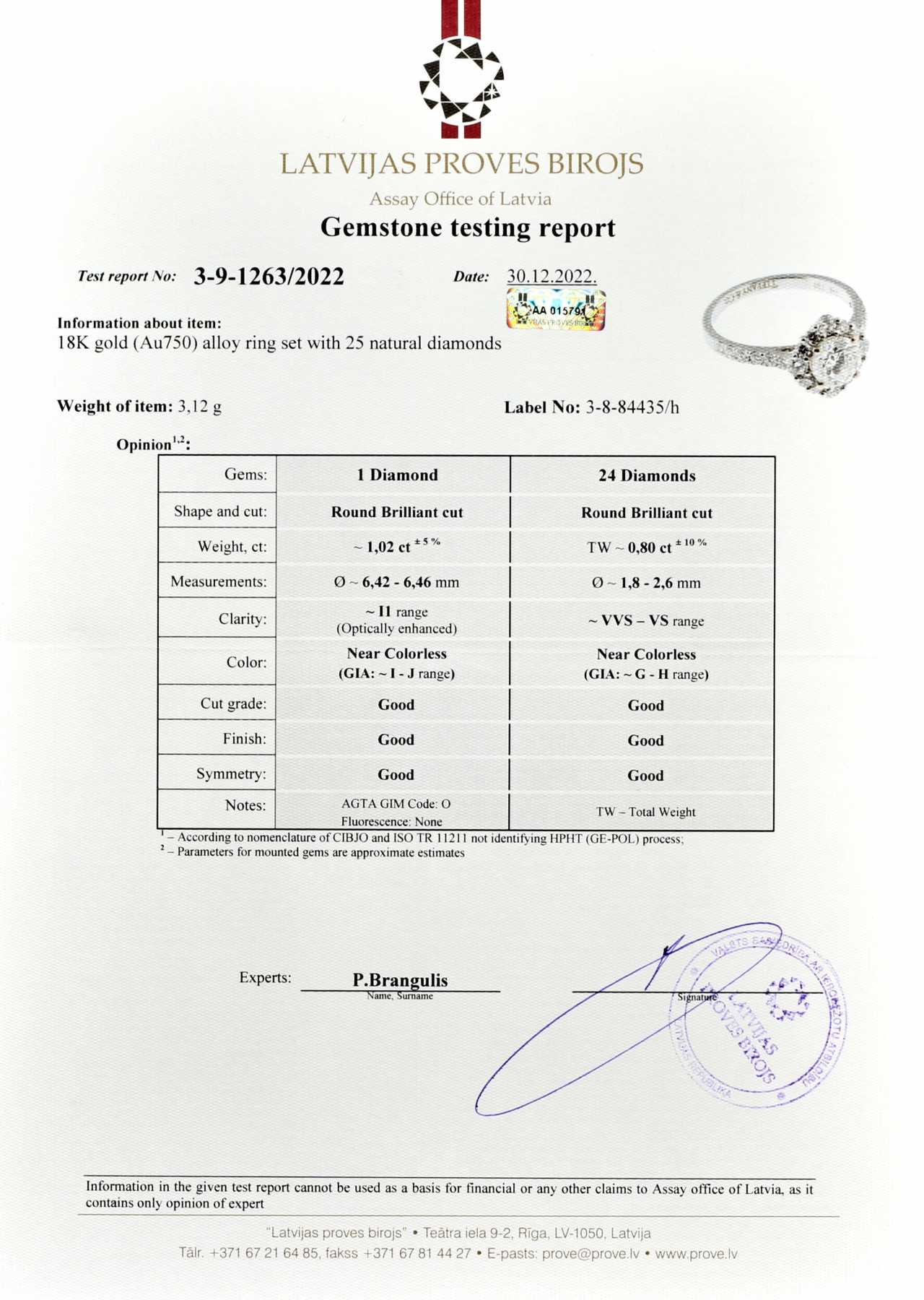 White gold ring, 750 assay value with diamonds. Central stone: 1.02 carats. IJ. 24 diamonds: 080 ct. VVS-VS. Weight: 3.12g. Ring size: 17. Certificate of the Latvian Assay Chamber 3-9-12632022.