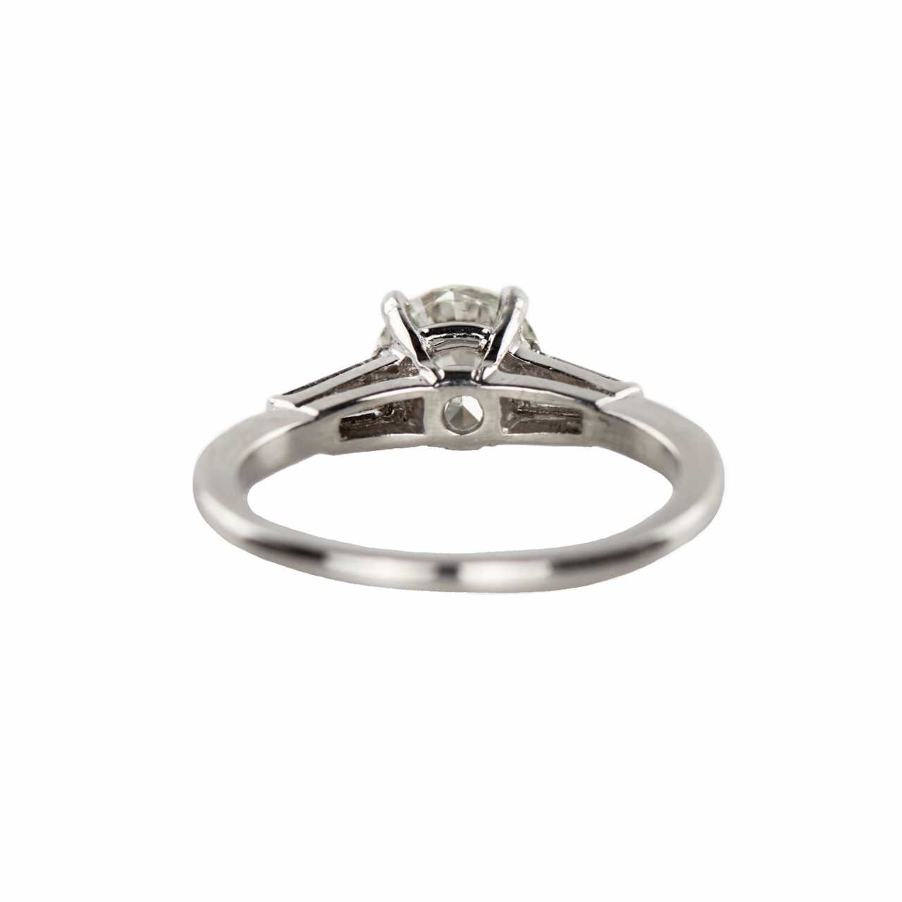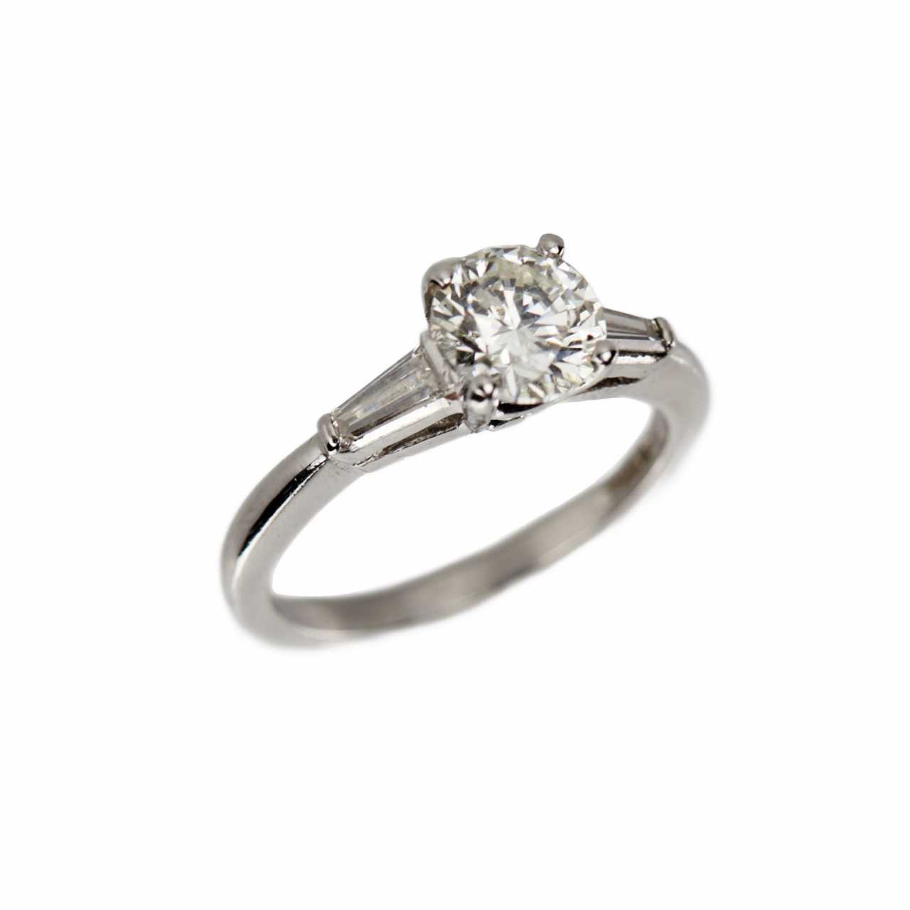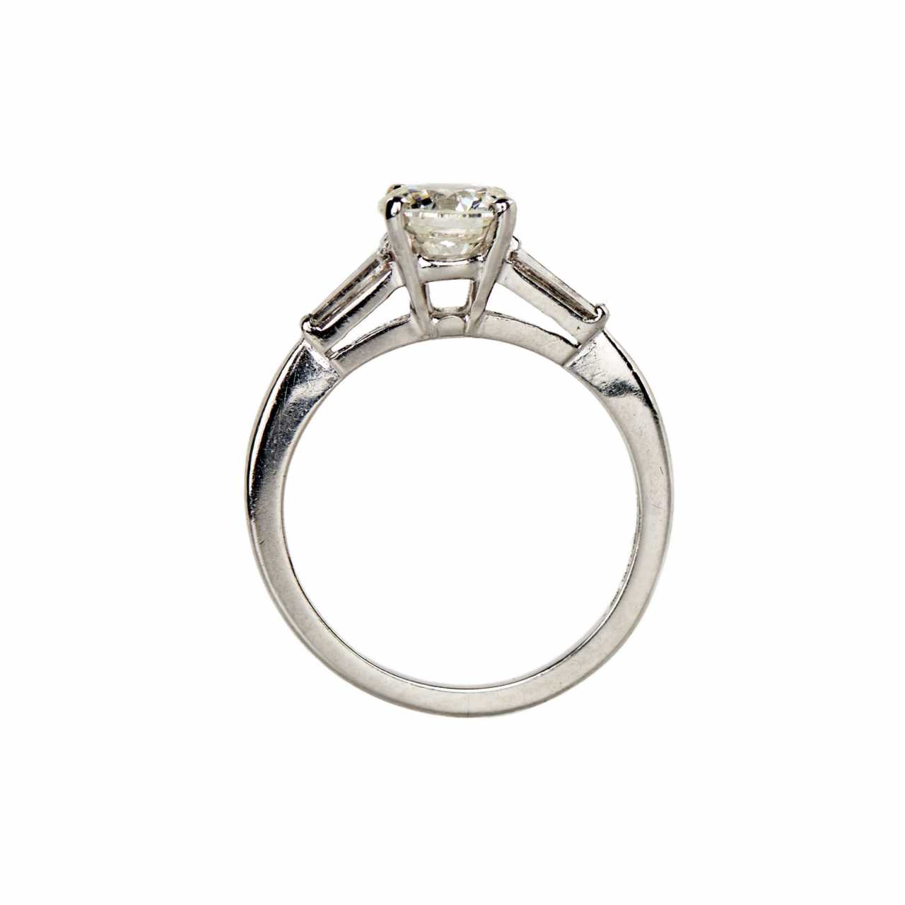Ring in platinum with classic composition diamonds. Central brilliant cut (Round cut), weight 1.05 ct, Clarity I1, Color J. Two baguette cut diamonds, weight 0.24 ct, VVS clarity, GH color. Ring size: 16. Weight: 4 gr.