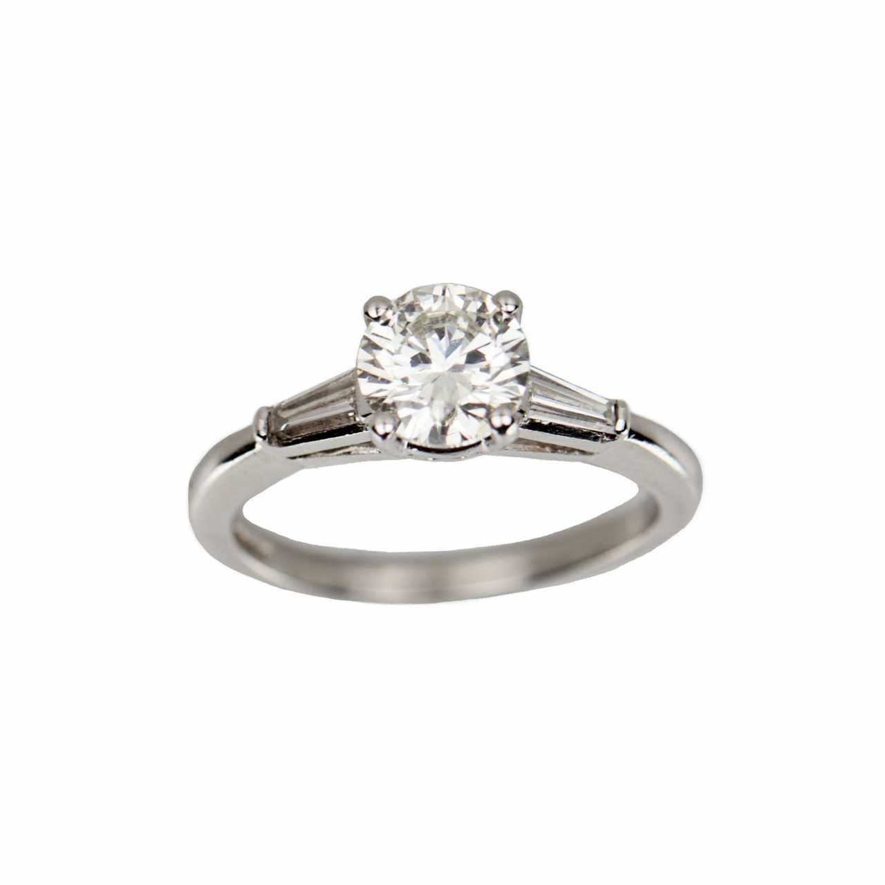 Ring in platinum with classic composition diamonds. Central brilliant cut (Round cut), weight 1.05 ct, Clarity I1, Color J. Two baguette cut diamonds, weight 0.24 ct, VVS clarity, GH color. Ring size: 16. Weight: 4 gr.